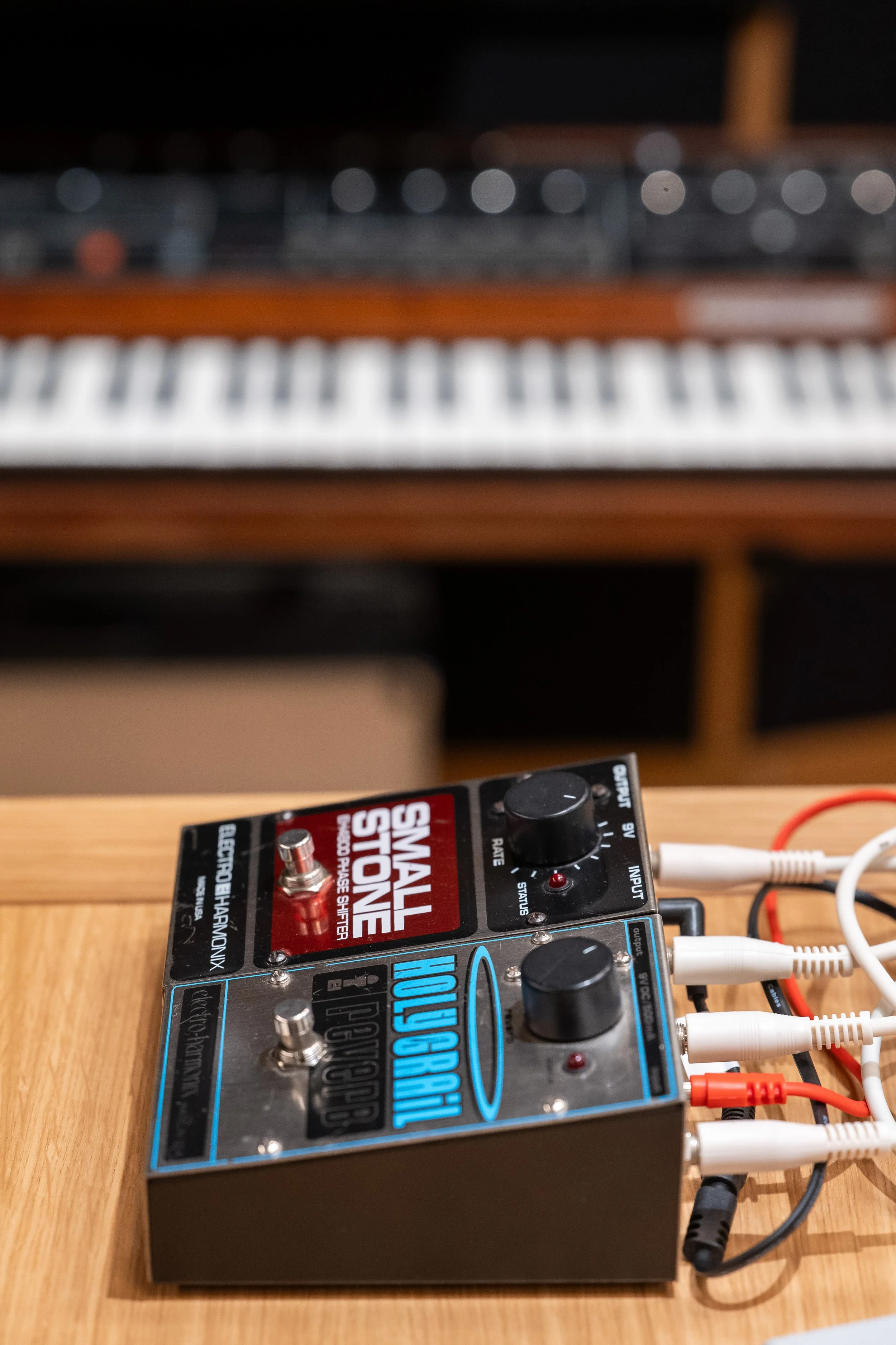 Bureau sur rail, qui permet de déplacer le bureau pour passer d’une session mix à une session live, en libérant de l’espace derrière. Il intègre une console vintage et des unités rackables un peu partout, faisant de lui un vrai couteau suisse musical.