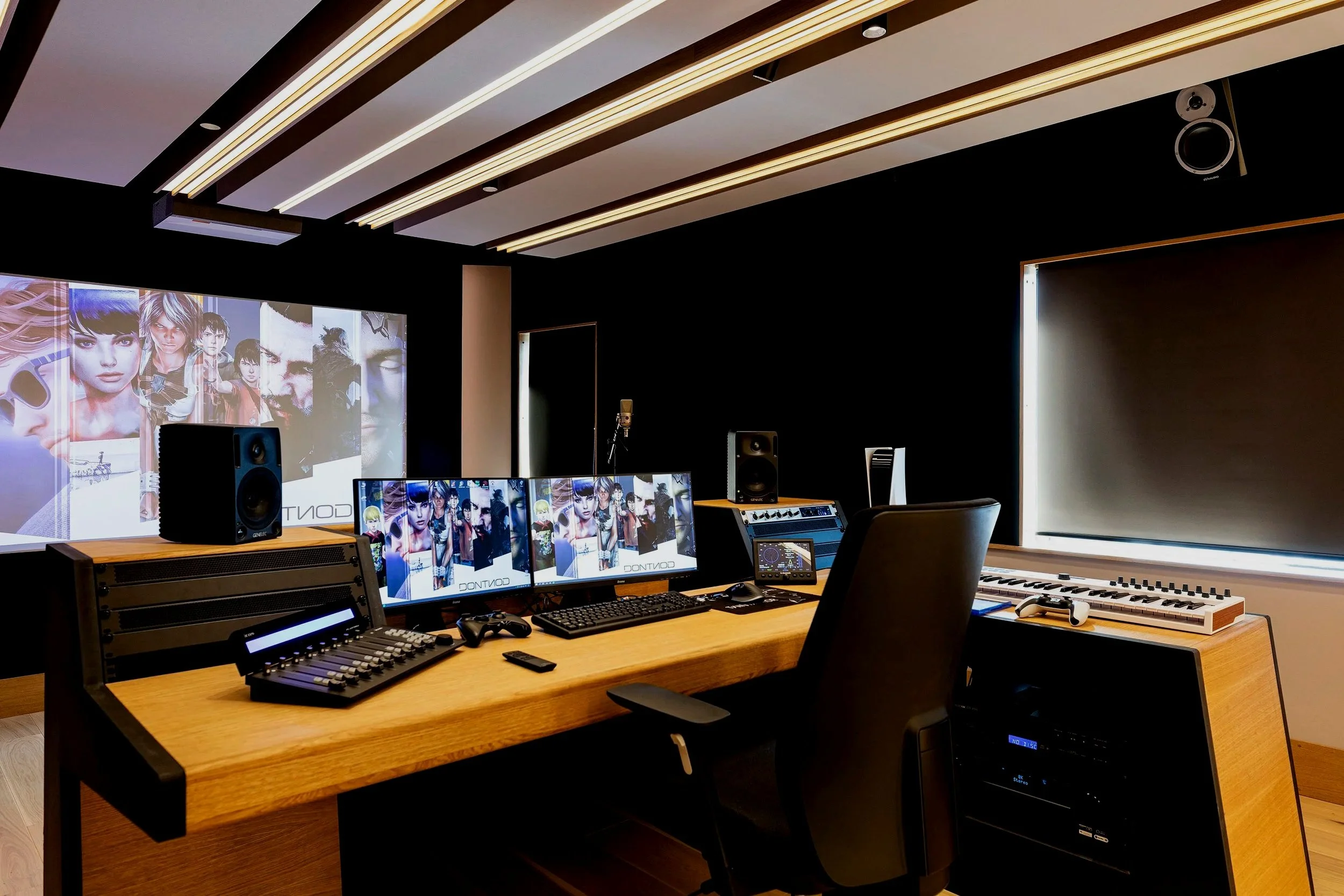 Chaque bureau de studio est conçu comme un véritable écosystème au service du travail sonore. Le dessin du mobilier, le choix des matériaux et l’implantation dans la pièce sont pensés en lien direct avec l’acoustique et les gestes du quotidien : composer, enregistrer, mixer, former ou accueillir des clients.
