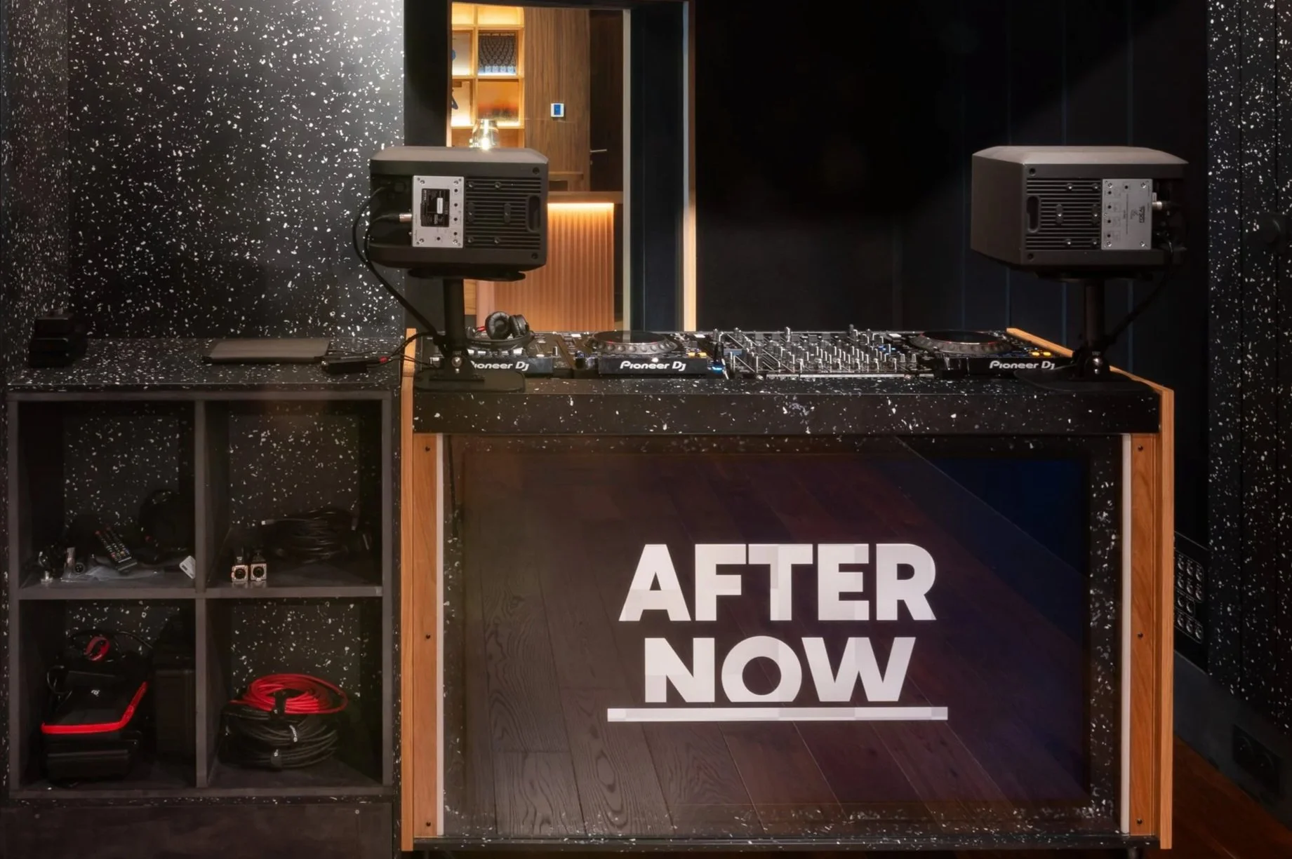 DJ Booth sur mesure intégrant 3 CDJ 3000, une mixette Xone, une TV et des néons LEDs. Le tout en chêne massif, valchromat et Le Pavé (plastique recyclé).