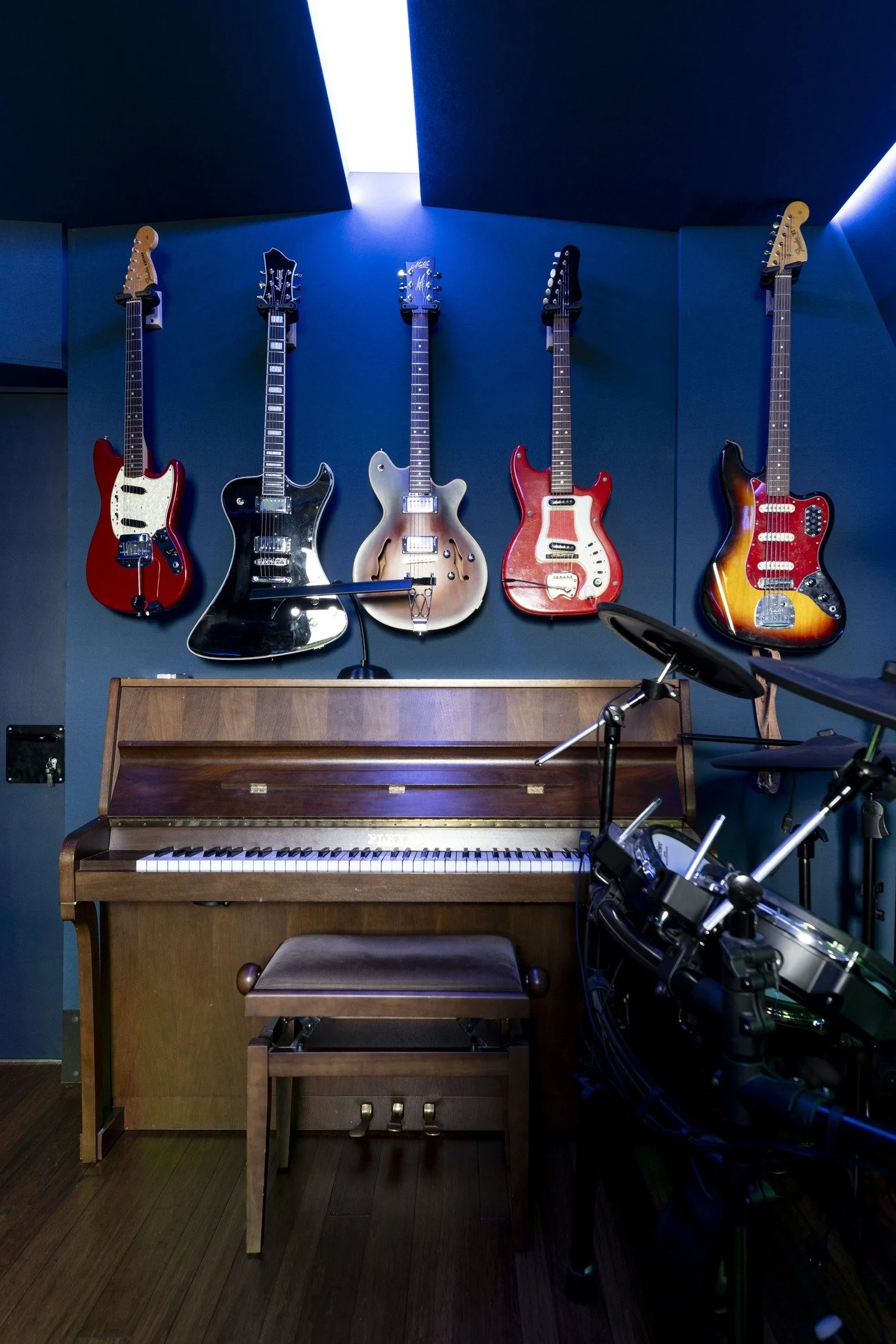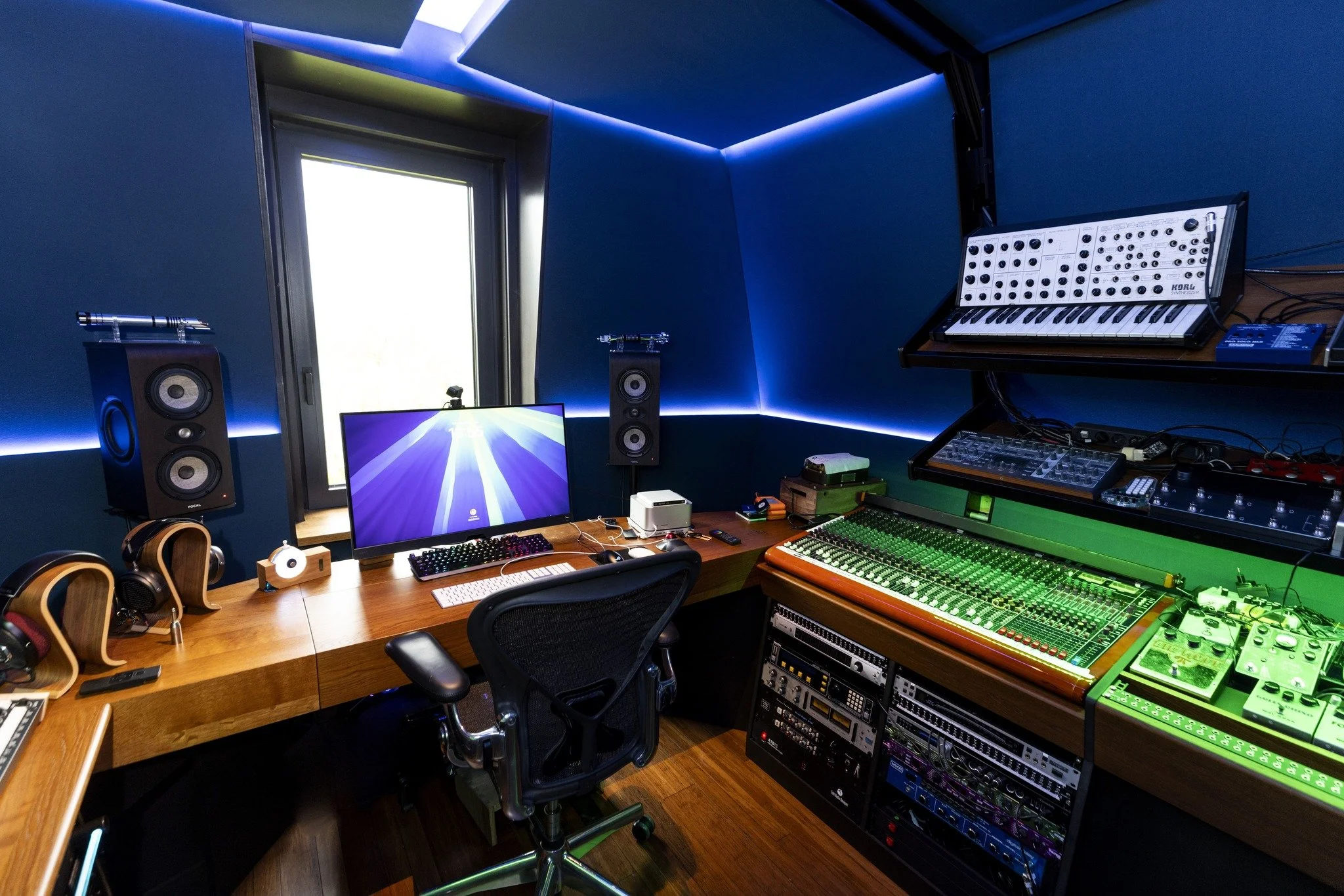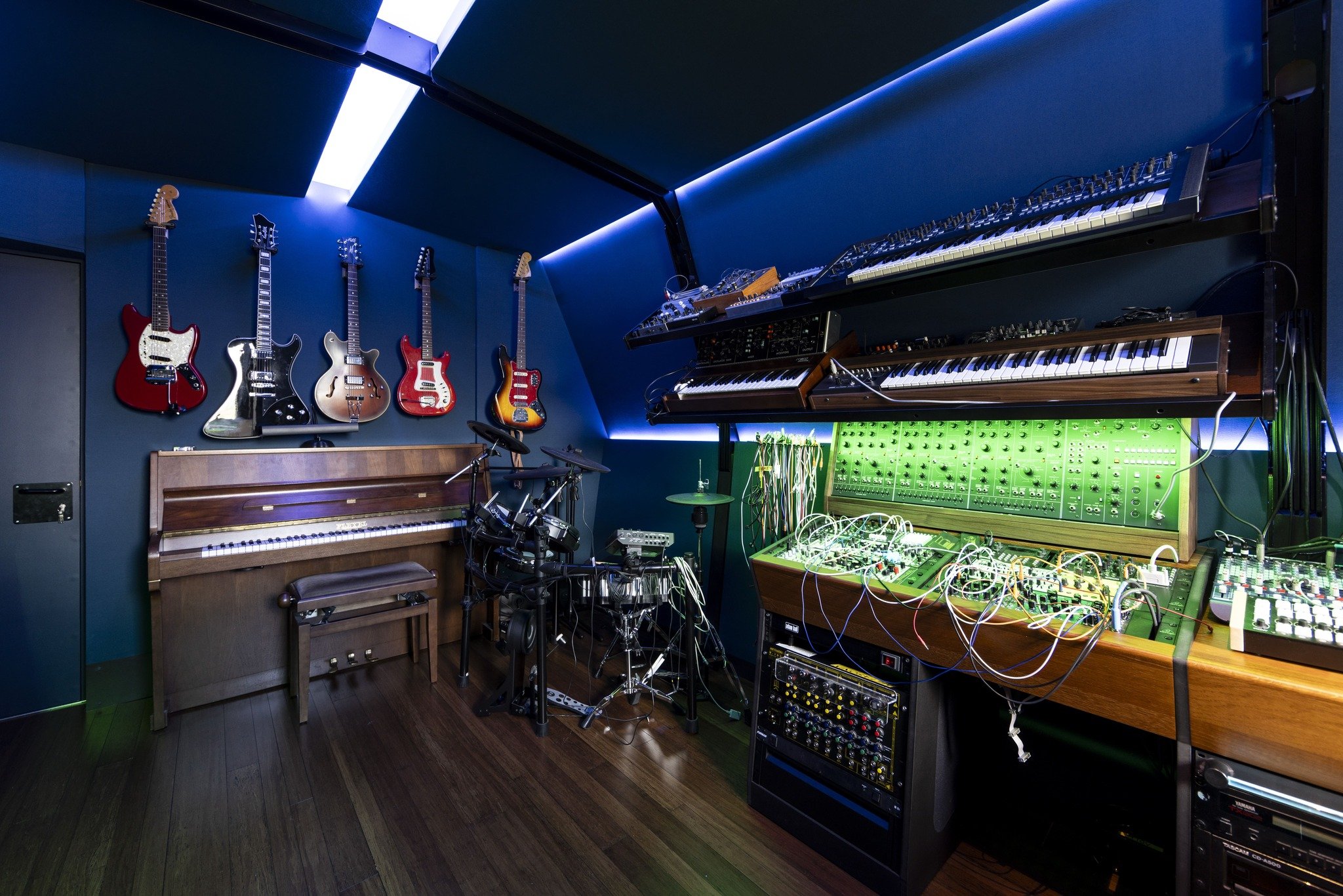 Le tout est baigné dans une ambiance sombre et bleutée. Les éclairages rasants et les dalles intégrées dans le plafond donnent une allure de cockpit de vaisseau spatial au studio.