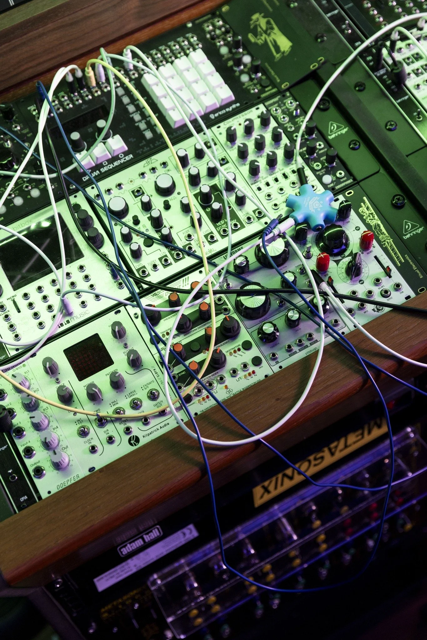Avec la belle collection de synthétiseurs et de pédales d'effets du client, il est vite apparu qu'un meuble et des étagère sur mesure seraient les pièces centrales du design. C'est pourquoi nous avons d’abord conçu un système d’arches en métal laquées enserrant les panneaux de traitement. Ces dernières sont équipées de crémaillères réglables pour disposer les claviers librement. Nous avons ensuite dessiné un vaste bureau intégrant 6 Euroracks de 84U pour le système de synthétiseur modulaire, un clavier maître, une console de mixage et un plateau patchable pour ses pédales d'effets.
